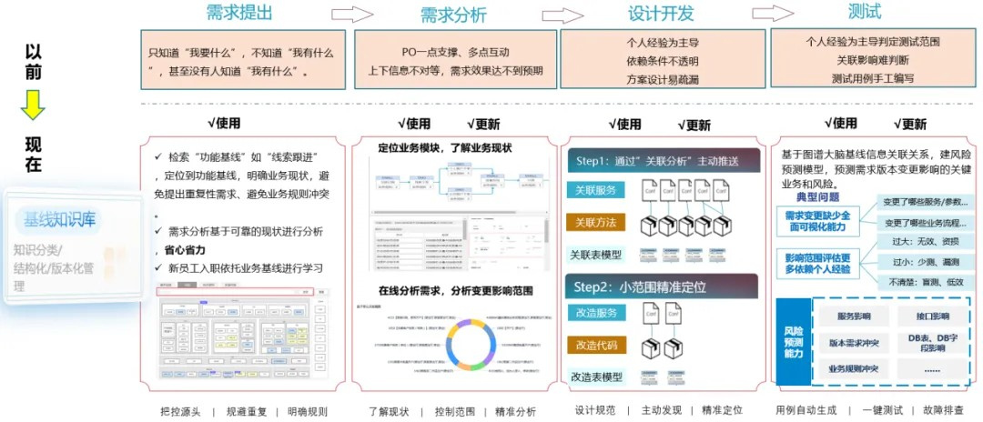 通过数智化需求知识图谱建设,将需求知识从点、线逐步汇聚成面:不断从需求过程中获取散落的业务流程、服务和数据模型等知识,形成业务流程和基线知识,并将基线知识进行串联,汇聚形成系统视图和业务视图。持续推动需求知识整合和数智化应用,将大模型技术应用到需求开发交付环节,深化“AI+需求交付”注智赋能,打造需求开发交付的“数字孪生”系统;
